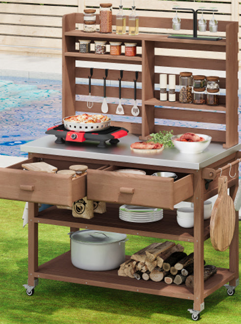 Outdoor Kitchen Island, Rolling Bar Cart & Storage Cabinet, Farmhouse Solid Wood Outdoor Grill Table with Stainless Steel Top, Spice Rack , Towel Rack for Kitchen & BBQ , Natural