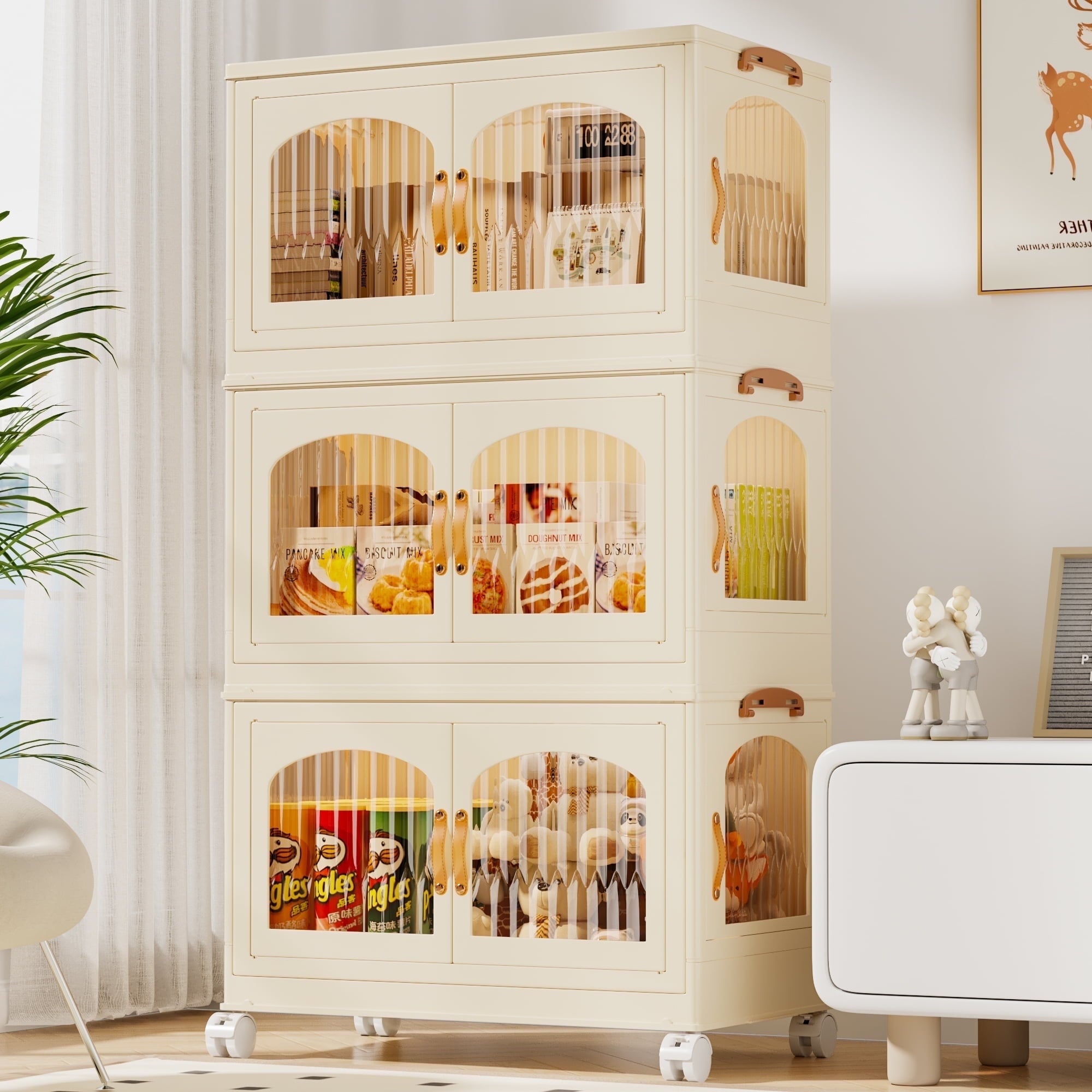 The behost 3 pack Large storage bins with lids. Total capacity 165L, offer ample storage space. It's perfect for organizing your home, dorm and garage! These stackable plastic containers are perfect for storing toys, books, and other household items. Beige color design is simple and fashionable, suitable for any home style. They are collapsible, making them easy to store when not in use, and come with doors and wheels for easy access and mobility. These storage bins are an essential for any apartment, kitchen, or office, keep your space tidy.