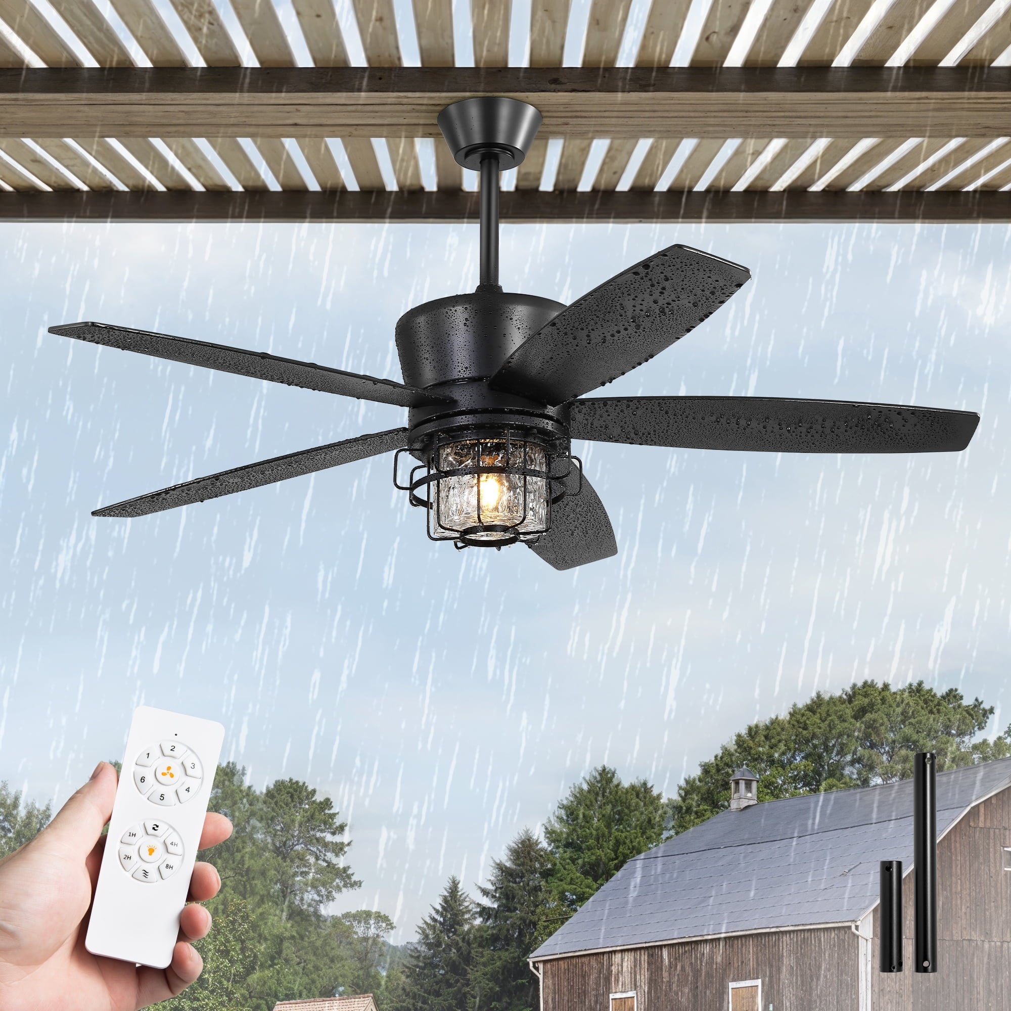 Zardon 52" Black Outdoor Ceiling Fan with Light - Remote Control, 6 Speeds, Waterproof,